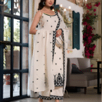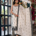 The intricately embroidered borders on the kurta hem, sleeves, and dupatta lend an aura of sophistication. With a breezy straight-fit silhouette and a soft, flowy dupatta, this ensemble is perfect for intimate get-togethers, poojas, office meetings, or calm festive days.