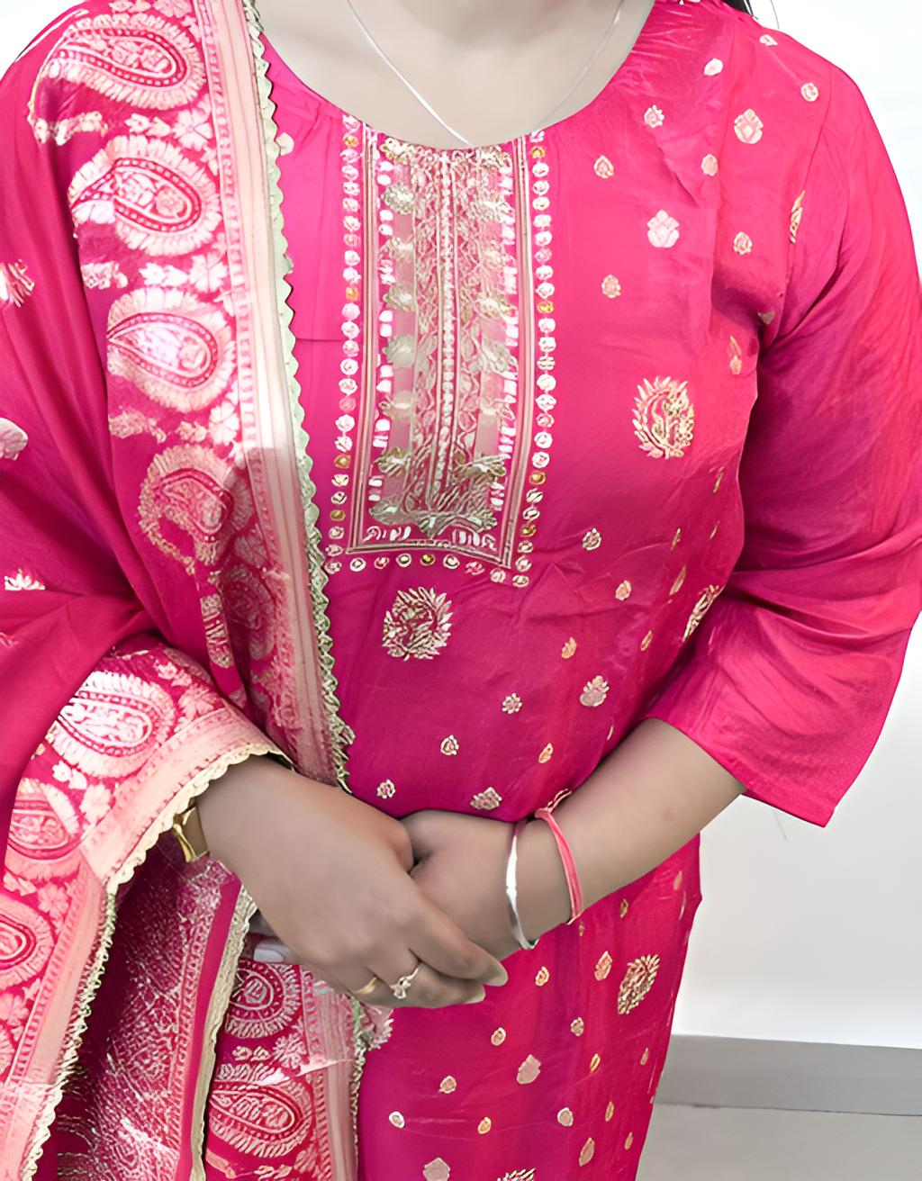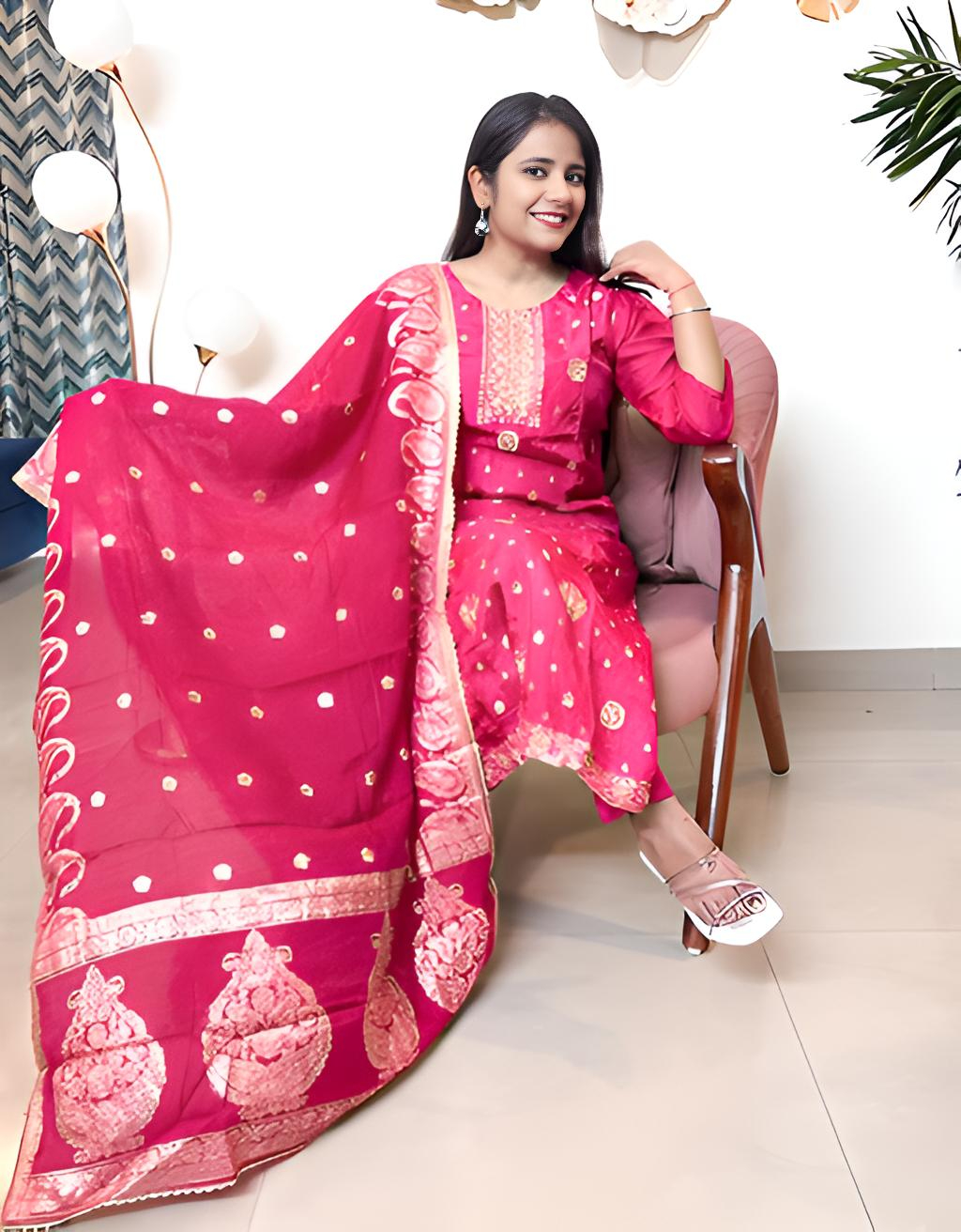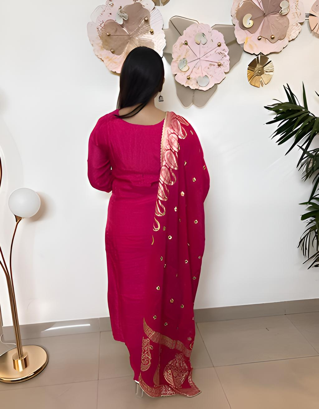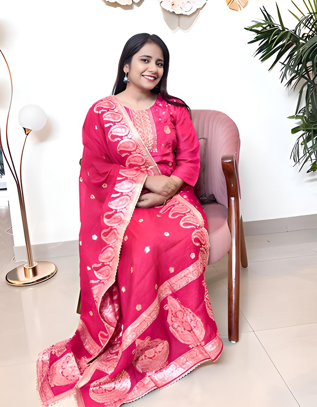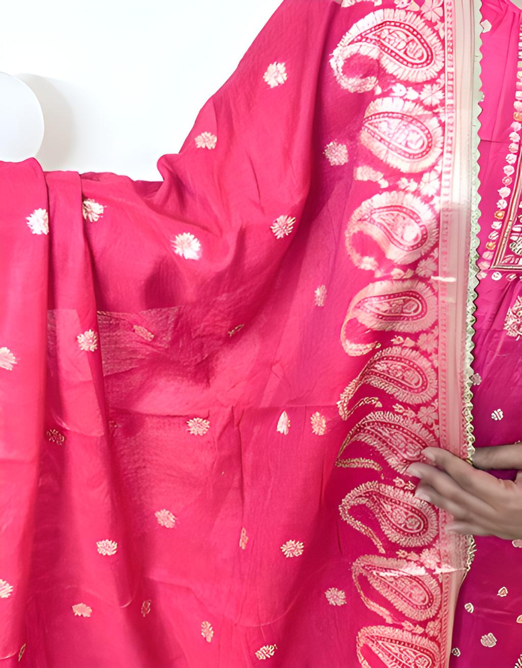 Dupatta: Rich Chanderi dupatta adorned with intricate golden motifs and border