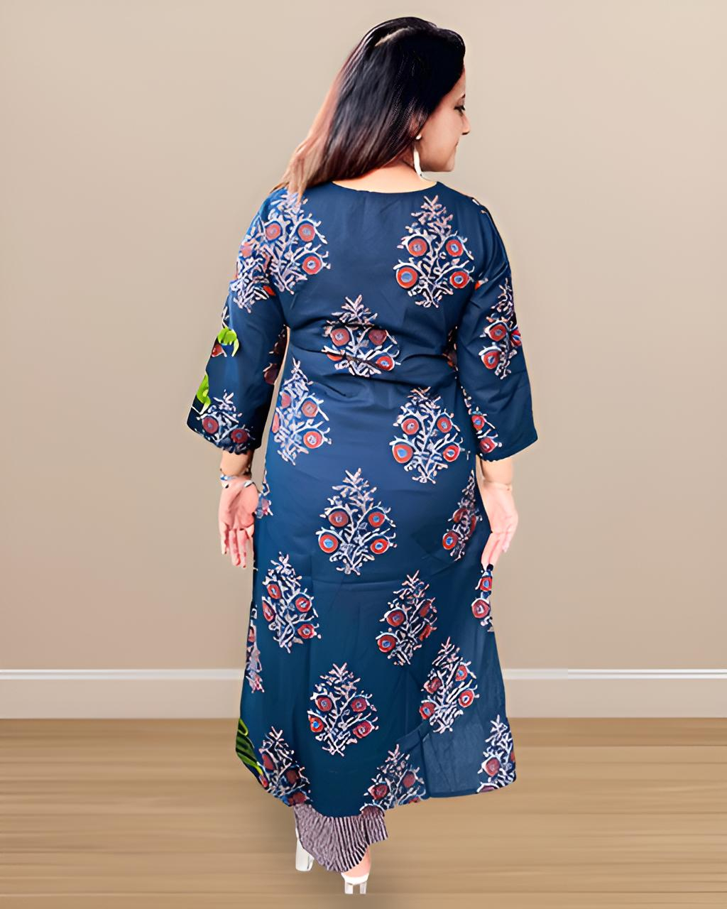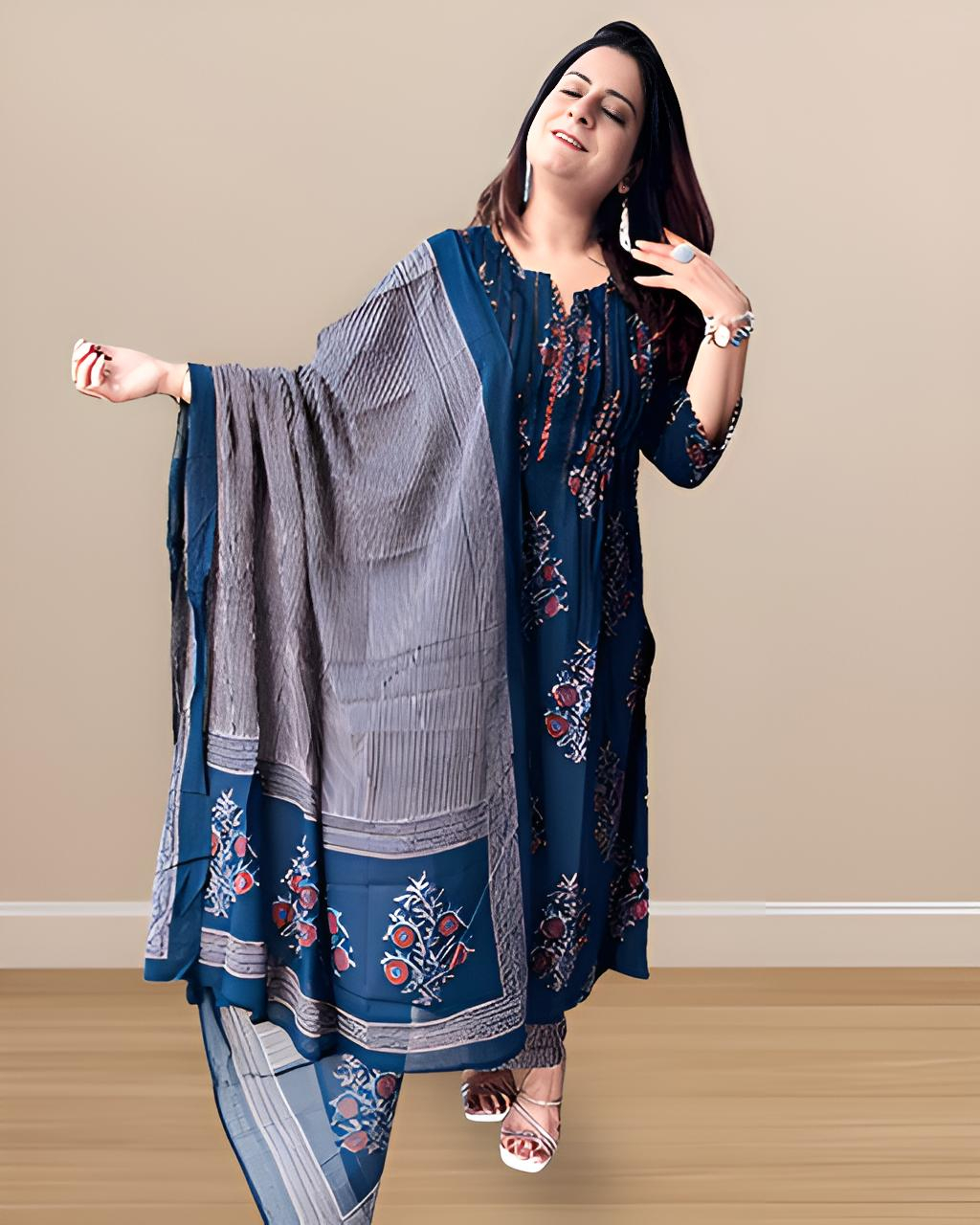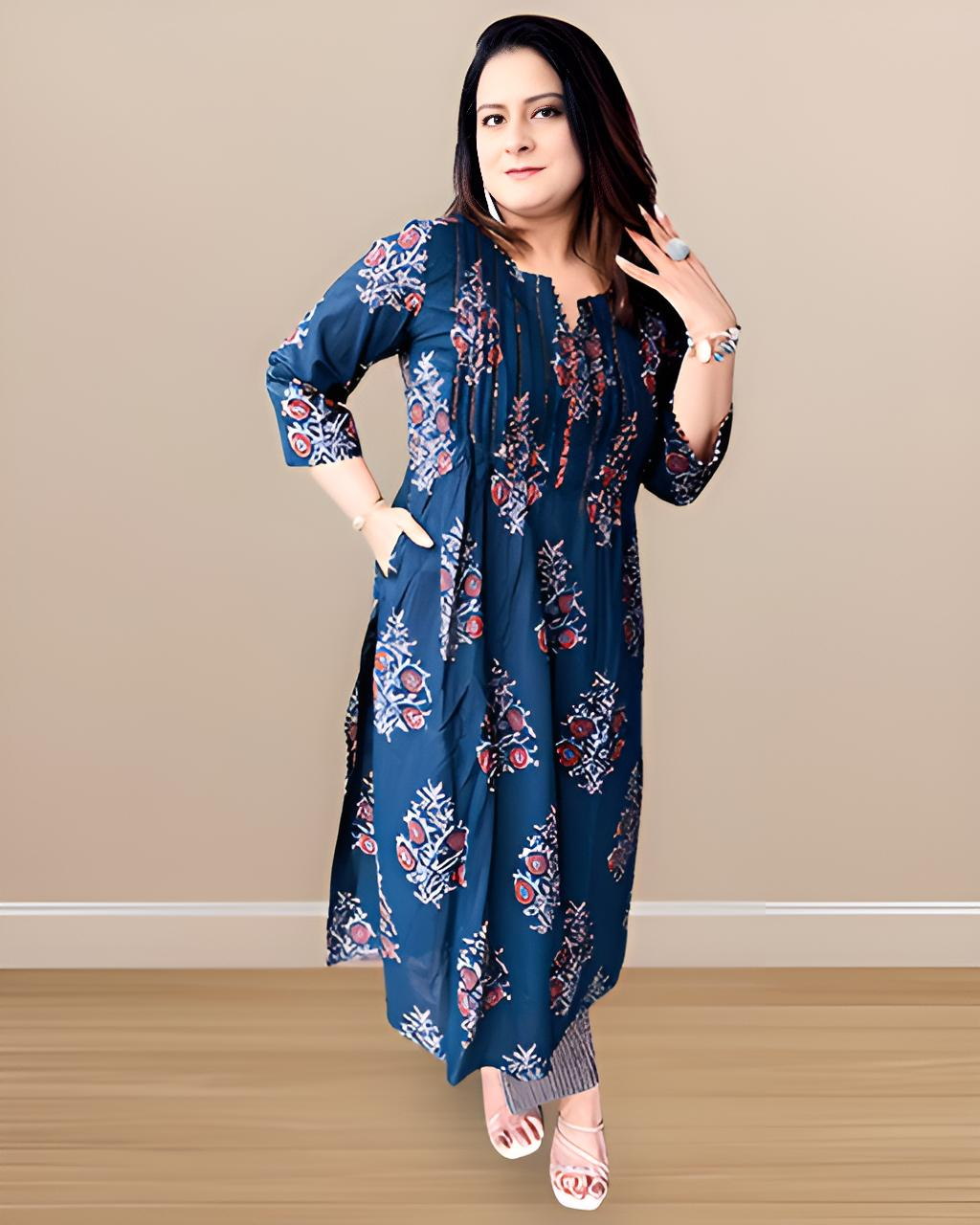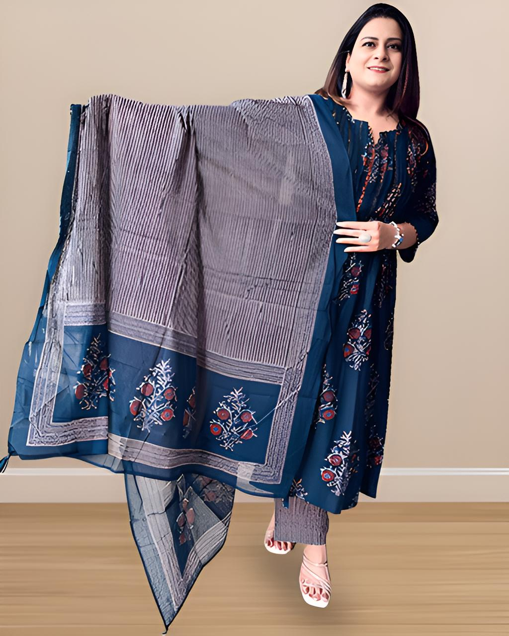 Step into poetic elegance with this breathtaking deep indigo blue kurta set paired with a soft, flowy dupatta—every thread whispering stories of heritage and hush-toned luxury. Adorned with delicate hand-block-inspired floral motifs in earthy reds and greys, this ensemble brings the wild garden to your wardrobe with regal subtlety.