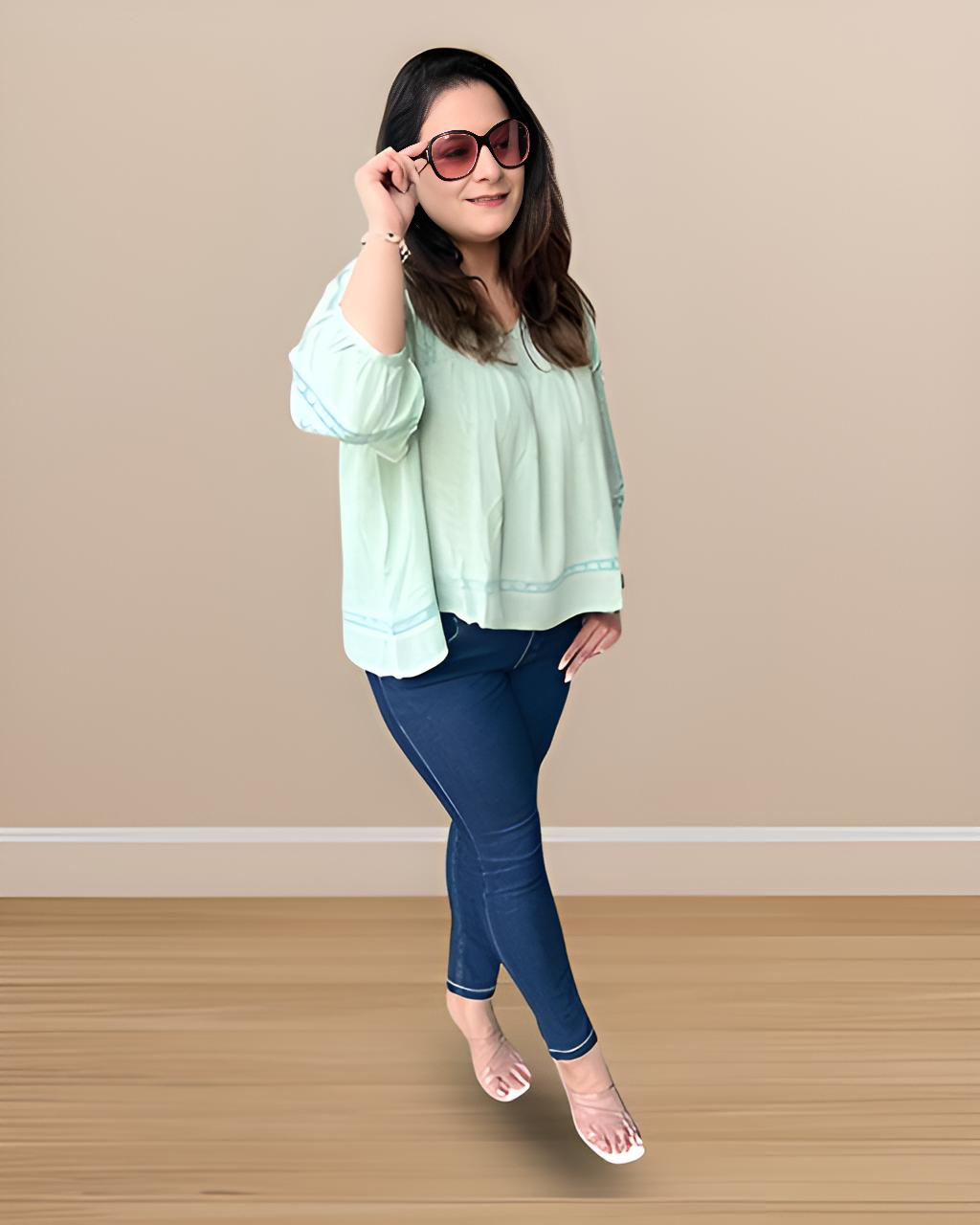 The V-neckline and lightly puffed 3/4th sleeves add a subtle charm, while the delicate stitch detailing near the hemline and sleeves speaks of quiet sophistication. This piece is as comfortable as it is stylish—perfect for warm days and effortless moods.