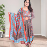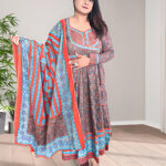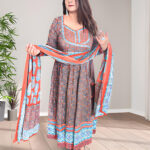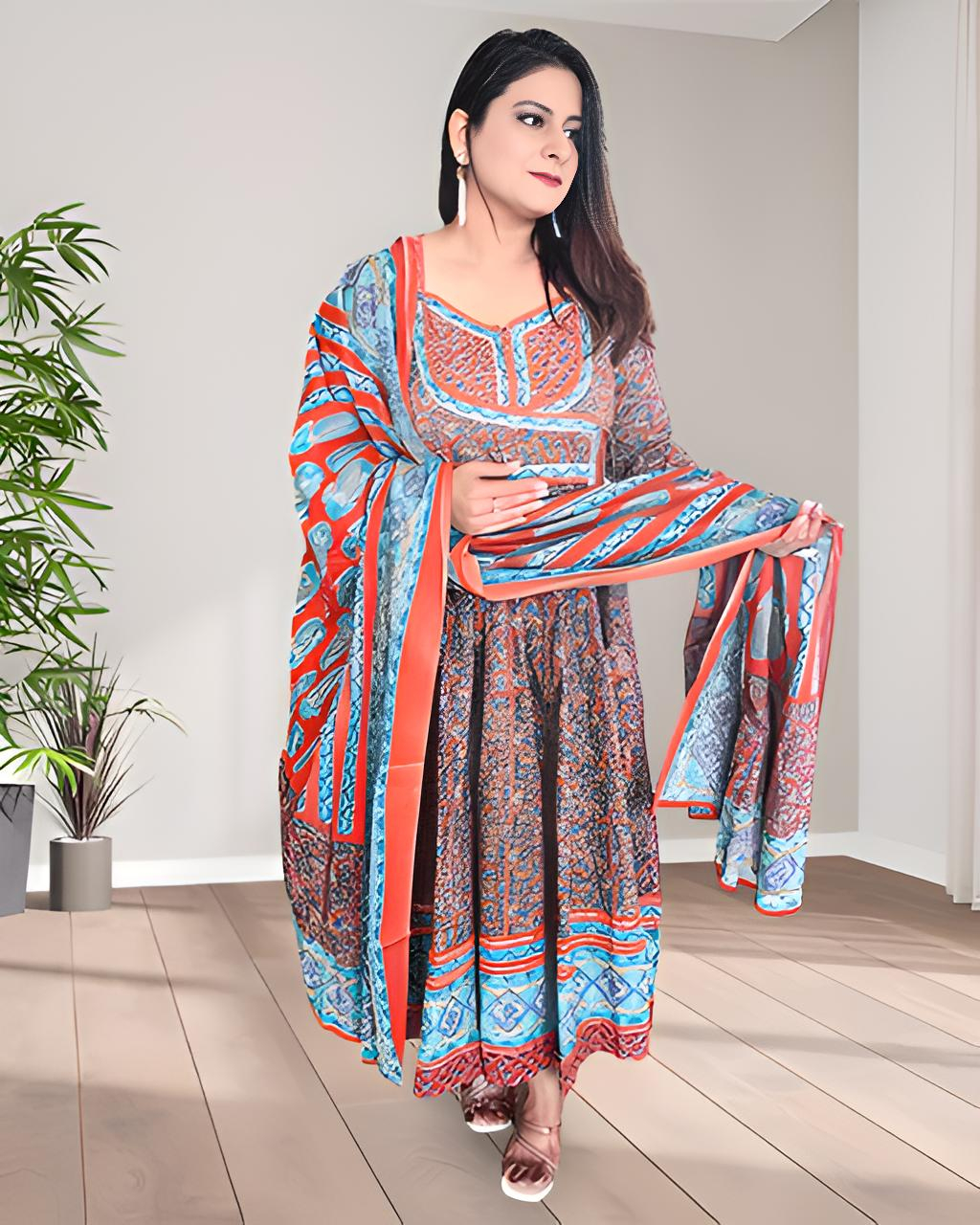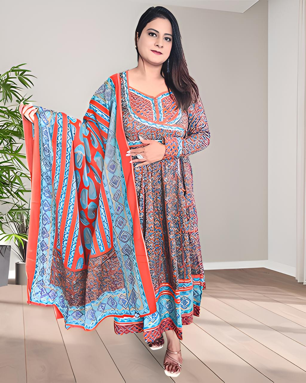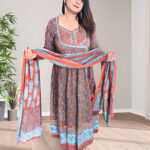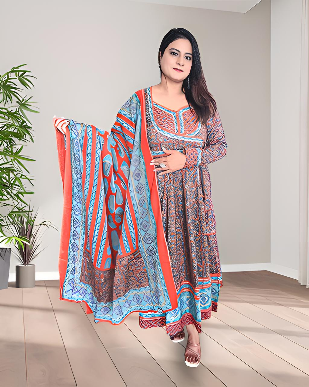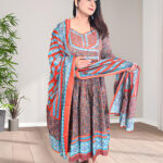 This stunning Anarkali-style kurta set is crafted from premium cotton blend, offering the breathability of cotton with the graceful fall of modal.