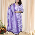 Step into a world where elegance meets ease with Saumya— a serene expression of timeless ethnic beauty. Designed for the woman who adores simplicity woven with sophistication, this three-piece suit set in a regal lavender-purple hue is a celebration of soft strength and quiet confidence.