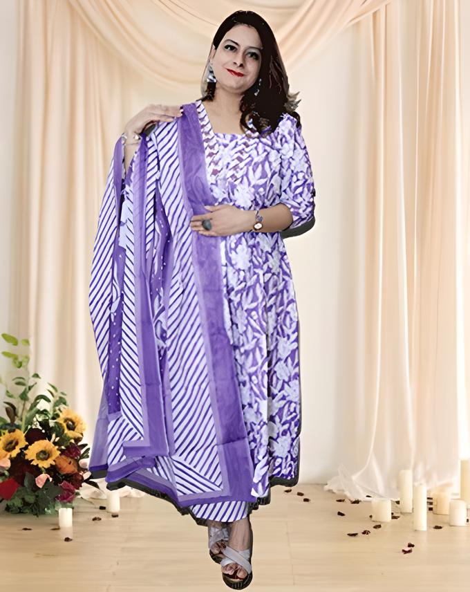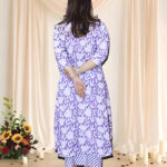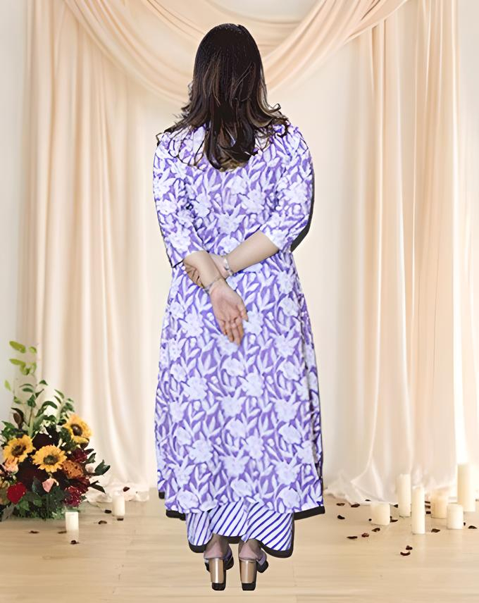 Crafted from premium 100% cotton, this outfit promises unmatched comfort, perfect for sunny days and breezy evenings. The kurta showcases hand block floral prints in pristine white, intricately sprawled across the fabric like a blooming lavender field kissed by morning dew. Its flowy silhouette is tailored to flatter all body types, making it a go-to for both everyday elegance and special moments.