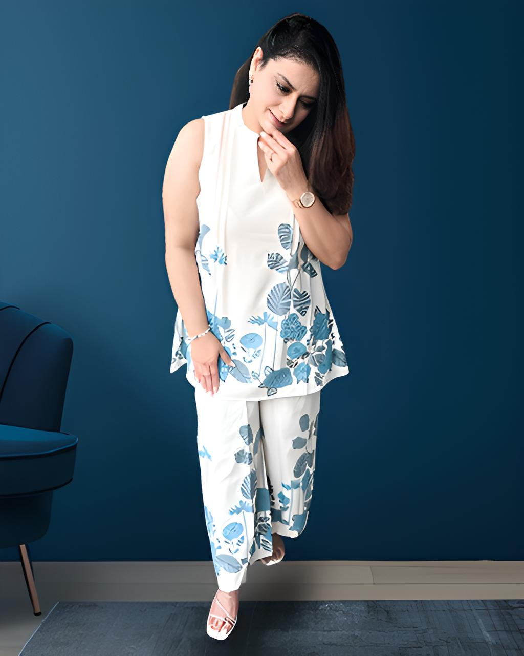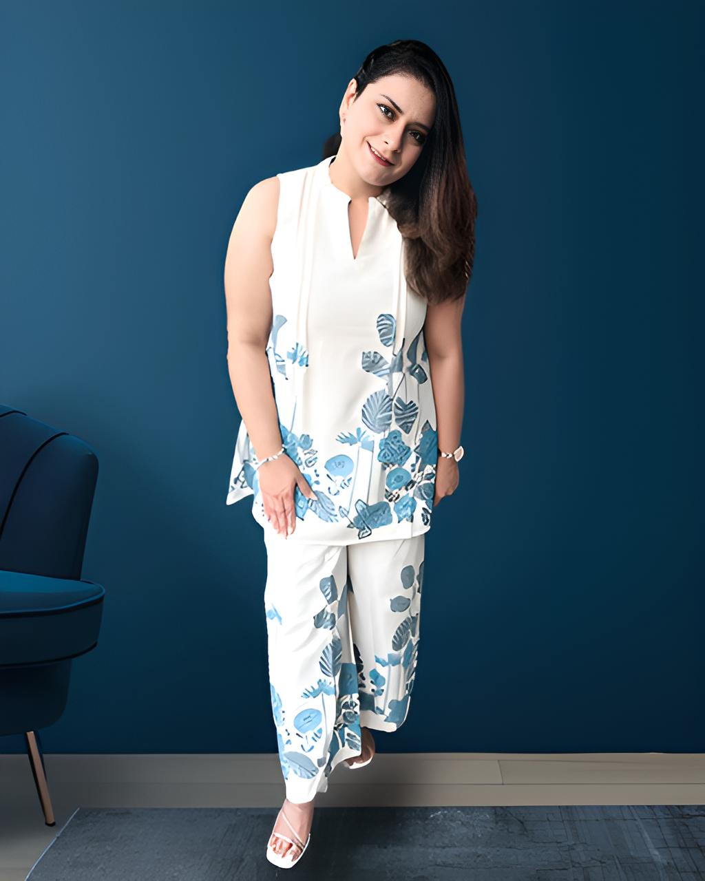 Draped in the purity of white and adorned with soft, dewy blue floral prints, this ensemble reflects grace, freshness, and tranquility — ideal for women who love calm beauty with character.